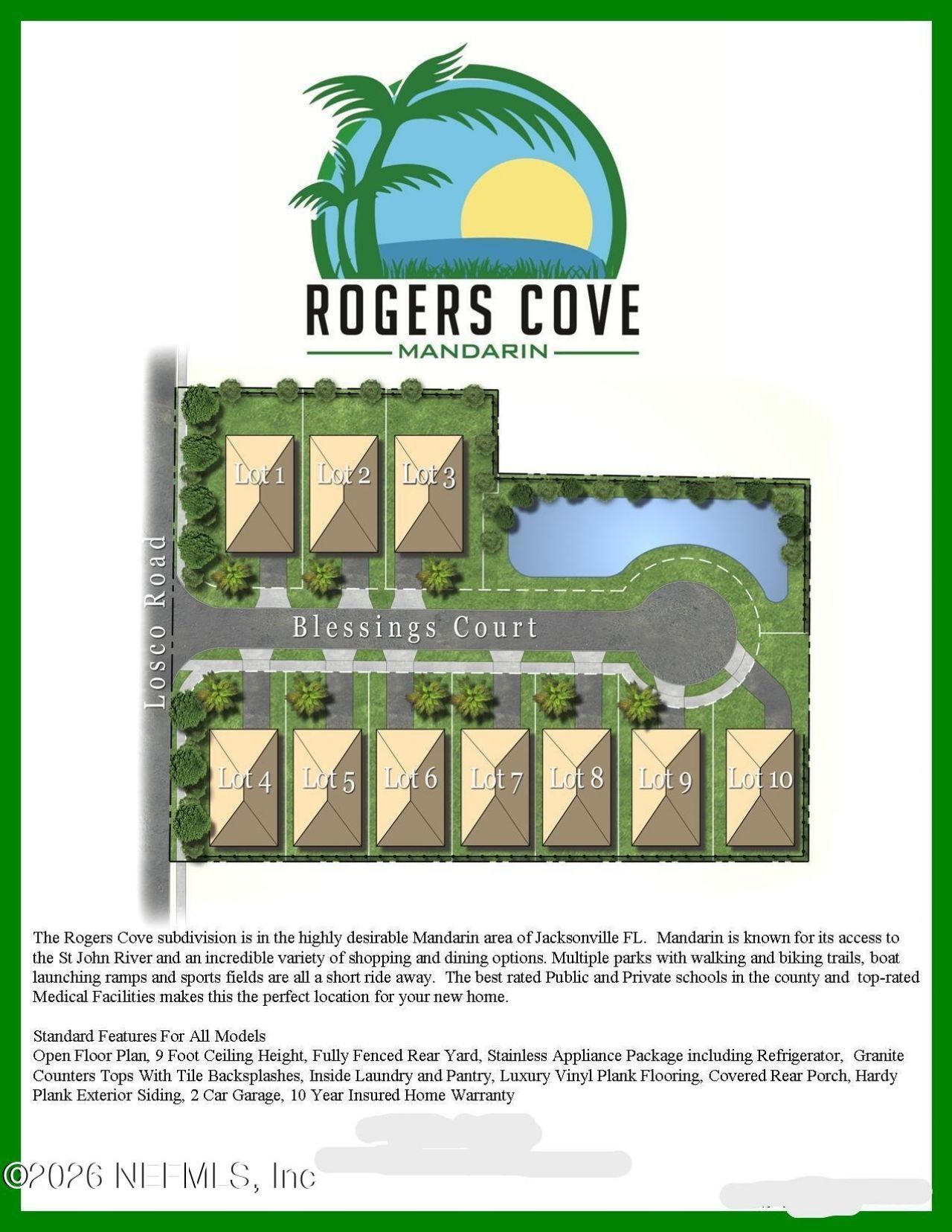 NEW CONSTRUCTION IN A 10 HOME BOUTIQUE COMMUNITY IN MANDARIN!! Close to Great Schools, Parks, Shopping, Restaurants and St Johns Boat Launch Ramp. Convenient to I-295 to access any part of town. This impressive 4 Bedroom, 2 Bath, 1941 sqft, one story home with two car garage and oversize Lot. Hardy Panel Exterior Siding. 9-foot Flat Finished Ceilings, Covered Rear Porch, Upgraded Finishes throughout with Premium Luxury Vinyl Flooring, 42'' All-Wood Cabinets, Quartz Countertops with Tile Backsplash in Kitchen, Full Stainless Appliance Package including Refrigerator, Inside Laundry Room with Custom Cabinets, Baths with Porcelain Tile Surrounds, Fenced Rear Yard, Ceiling fans in all rooms, Insulated Garage Door with Electric Opener. Builders 10 Year Warranty through 2-10 Warranty. Seller Concession to pay all Closing Costs with Buyers financing with the Preferred Lender. House Plans, Standard features and Lot Survey in Documents. HOUSE IS READY FOR IMMEDIATE OCCUPANCY.