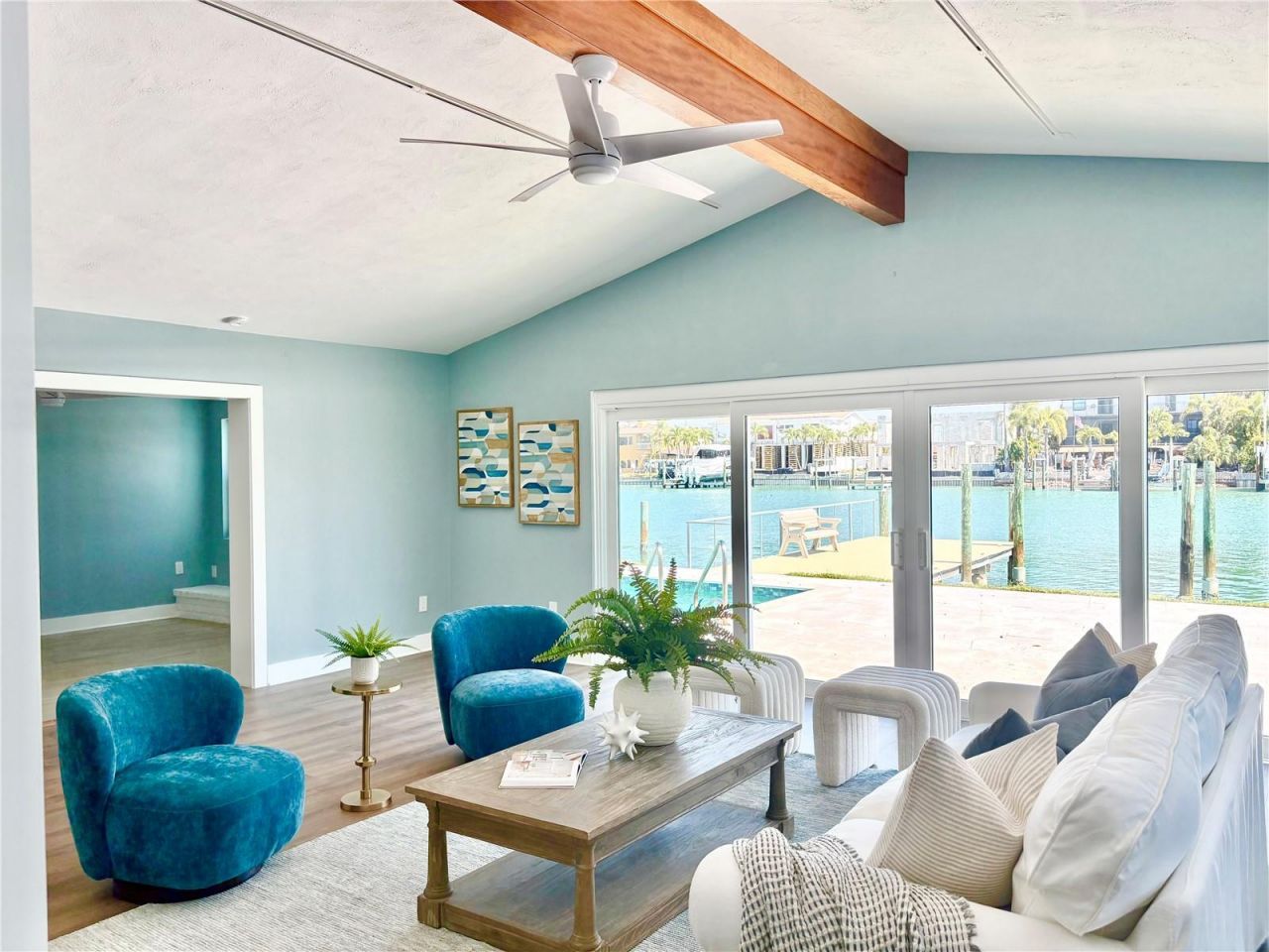 WELCOME TO PARADISE and a new lower price! Less that $560.00 per square foot! This 3-bedroom, 2-bathroom split-plan home has over 2,400 heated square feet plus an oversized garage and inside laundry! (Over 3,000 square feet in all!) It features 70 feet of water frontage on a wide canal with partial views of the bay and bridge. This home also offers a newer pool (2020), new kitchen appliances (2025), a new hot water heater (2026), a newer roof (2019), a composite dock, concrete wrapped poles and deep sailboat water. Also, for the boaters, you have direct Gulf access with no fixed bridges - you'll be in the open waters of the Gulf in roughly 10 minutes! The wide paved street offers plenty of room for guest parking, along with the newer paver driveway. This home was flooded during Hurricane Helene and was immediately remediated. All renovations have been performed by a licensed contractor, and all permits have been pulled. The best sunsets on the coast are only a short drive or an 8-to-10-minute walk away. Flood insurance is transferrable and is only $2702.00/year! Beautifully staged by the Aro Chic Team.