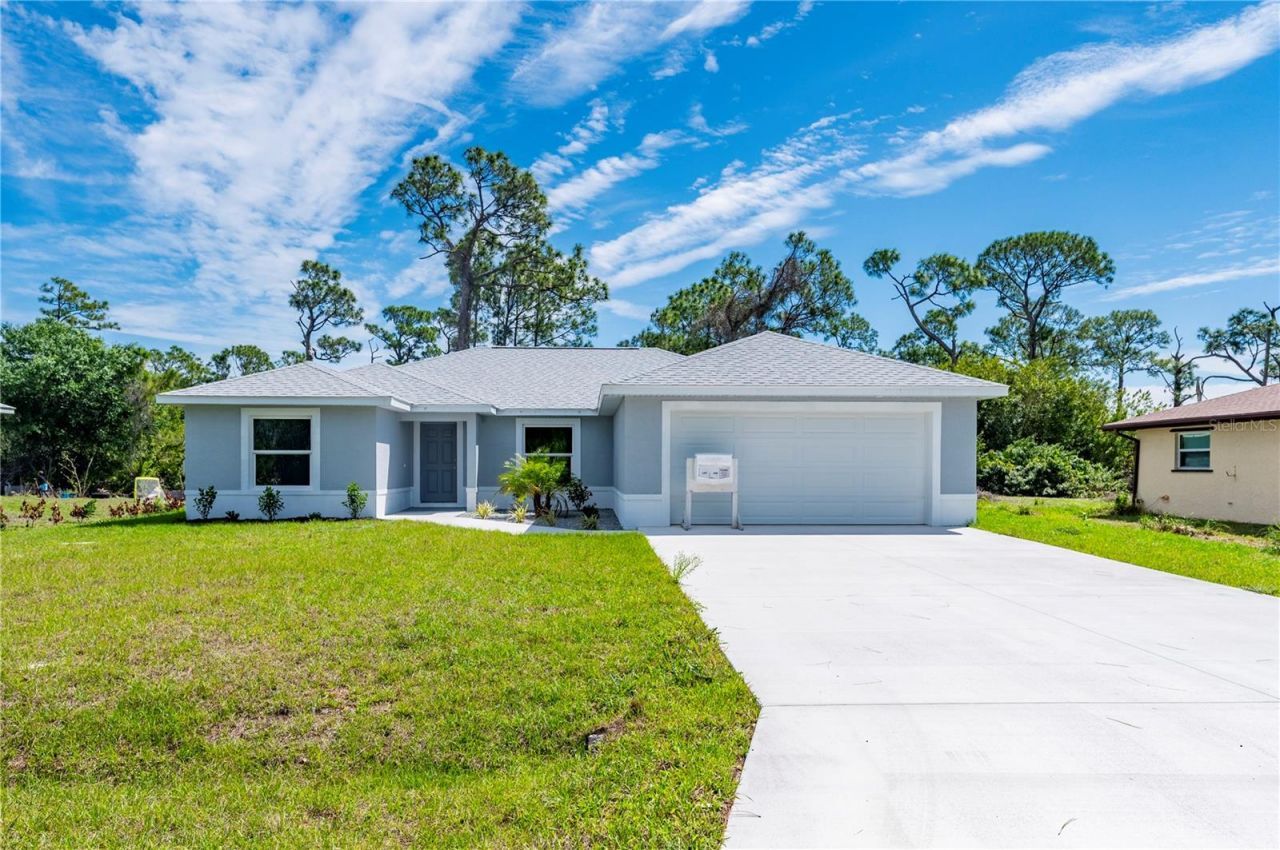 One or more photo(s) has been virtually staged. A HIGH QUALITY, NEW CONSTRUCTION HOME AT A GREAT PRICE! MANY UPGRADES INCL STORM IMPACT WINDOWS/DOORS AND A NON-FLOOD ZONE! COMPLETED AND READY FOR YOU TO MOVE-IN!! Beautiful, Energy Efficient Impact Rated Home with an Open floorplan including a spacious Great Room and Dining area, 3 Bedrooms, 2 Baths, and an Oversized 2-car garage. Underground electric service to the home, storm impact windows, impact entry doors, impact garage door and impact sliding doors all attribute to the storm protection assets of this quality-built home! No hurricane shutters to install or store! The attractive open Kitchen has quality soft close wood cabinetry, granite counters, undercabinet countertop LED lighting, tiled kitchen backsplash, and an upgraded kitchen appliance package. Flooring throughout the home is a beautiful Luxury Vinyl Plank (LVP). A spacious Primary bedroom leads directly into the Primary bathroom with double sinks, granite counters, oversized shower, separate water/toilet closet, and on to the large Master closet which connects directly to the Laundry room. How convenient! No need to travel across the house to do laundry! Guest bath also has granite counters and tiled shower with tub. All closets have 2 tiered free slide shelving for increased hanging capacity. Picture view screened Lanai. The high efficiency, 16 seer AC unit includes 10 yr manufactures warranty in parts, and duct work is double sealed at all joints with the Air Handler conveniently being recessed in the Garage Ceiling to allow owner more garage space. The Driveway offers a wide 20' entry versus the standard 16' into the double garage, garage door openers/controllers. Secondary waterproof roof membrane. Construction by a Local Builder who's been building homes for 40 years in Charlotte County and provides a 1 Year Home Warranty. Close to everything!! Shopping, restaurants, I-75, and Sunseekers Resort! This model may be built on other available lots or build on your lot!