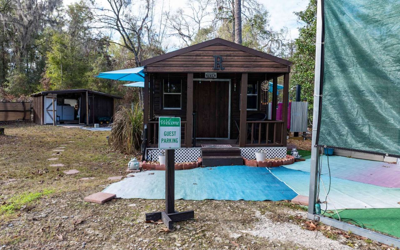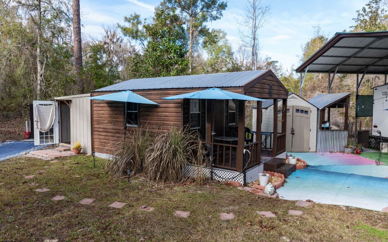 Welcome to your private getaway or ready-made investment property! This beautifully set up 0.91-acre parcel offers a unique blend of comfort, functionality, and outdoor living—currently operating as a successful Airbnb and ready for immediate use. The property features a charming 1 bedroom, 1 bath 168 sq ft tiny home (currently homesteaded on the Property Appraiser website) that is thoughtfully designed for efficiency and comfort. Enjoy the added bonus of an outdoor solar-heated shower & toilet and a fully equipped outdoor kitchen, perfect for entertaining or embracing relaxed, open-air living. Also included is a 2021 22-ft camper, expanding guest capacity or providing flexible living options. The property is fully RV-ready with both 30-amp and 50-amp RV service, making it ideal for travelers or multi-use living. For work or creative pursuits, there is a separate office space with air conditioning, plus two additional sheds—both climate-controlled with A/C—perfect for storage, workshops, or conversion to additional usable space. Property sold as turn-key with portable generator, washer/dryer, well, septic and fully furnished. All meticulously maintained. NO HOA, but $250 annual voluntary to gain access to the 7 river parks.