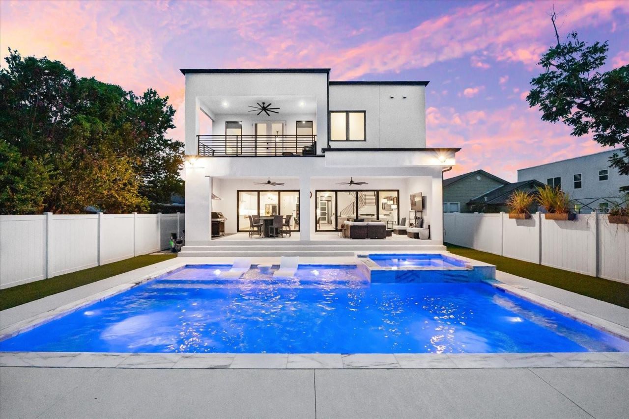A home of rare presence and purpose, 2707 Ridgewood Avenue blends refined architecture with effortless livability in one of Tampa's most established neighborhoods. Completed in 2023 by NEO, this five-bedroom, four-and-a-half-bathroom residence is defined by clean lines, intentional flow, and beautifully curated materials. From the moment you enter, natural light pours through oversized windows, setting the tone for airy, open-concept living. Wide-plank engineered hardwood floors guide you through soaring spaces that feel both expansive and grounded. The kitchen-centered around an oversized island-is outfitted with high-performance appliances including a gas cooktop, wine refrigerator, and tankless water heater, with custom cabinetry and stone surfaces throughout. The great room opens through sliding doors to a private outdoor retreat. A heated saltwater pool and spa are surrounded by covered lounge areas, a built-in grill, and Florida-friendly landscaping with irrigation, all enclosed by privacy fencing, turf lawn. It's a seamless extension of the home-designed for entertaining, built for quiet moments. Upstairs, the primary suite offers spa-like comfort, complete with soaking tub, glass shower, dual vanities, and a custom walk-in closet. French doors open onto the balcony overlooking the city. Three additional bedrooms are generously sized, each offering en suite bathrooms with built-in closets. A full-size laundry room is conveniently located on the second floor. The fifth bedroom, located on the main level, is ideal for guests, den-office-study or multi-generational living. Additional features include a two-car attached garage, touchless entry, security lighting, water softener system, and energy-efficient climate control. Built on a stem wall foundation in Flood Zone X, the home qualifies for hurricane insurance deductions and offers long-term peace of mind. Ideally located just minutes from Tampa's Riverwalk, Armature Works, and Downtown, this property offers sophistication, flexibility, and a lifestyle rooted in both design and location.