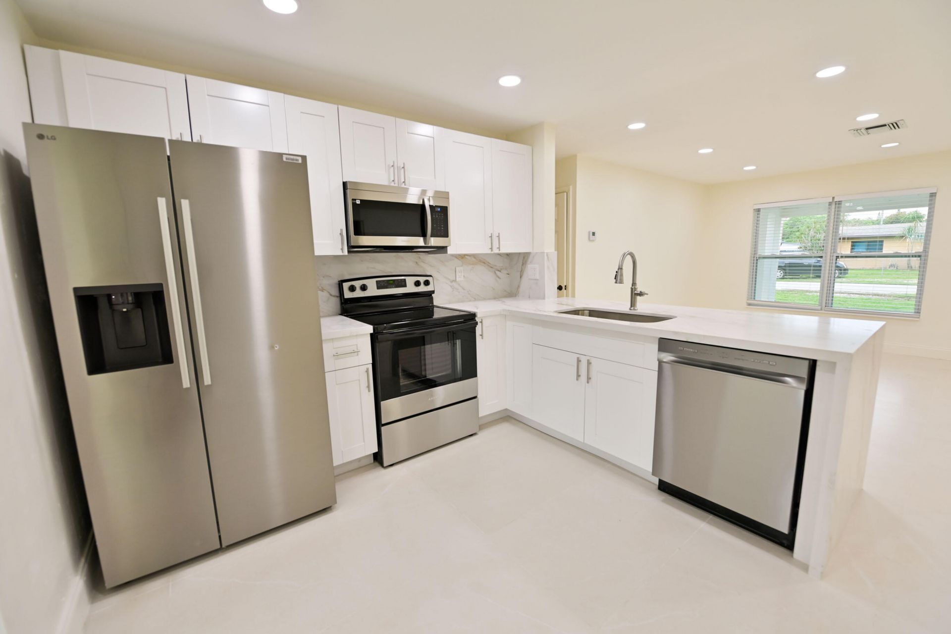 Fully renovated 3 Bedroom / 2 Bathroom + Den single-family home. Move-in ready with brand-new modern kitchen featuring quartz countertops, stainless steel appliances, and 24x48 porcelain tile flooring throughout. Freshly painted interior, updated bathrooms, and new central A/C. Impact windows for safety and energy efficiency. Spacious fully fenced backyard, perfect for outdoor living. Great location near shopping, dining, and major roads. No HOA. Available for immediate occupancy.
