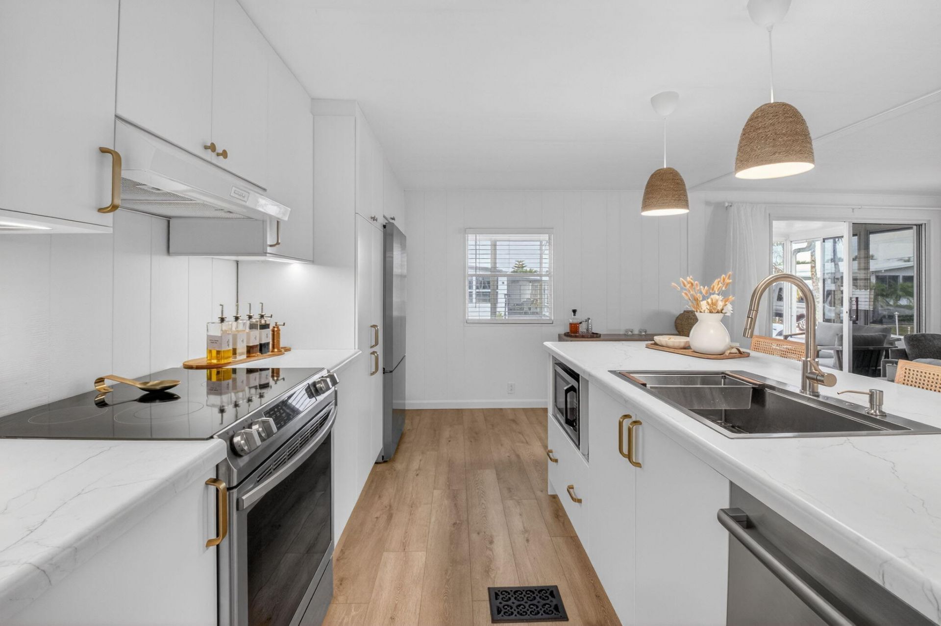 Completely TURNKEY! This beautiful COMPLETELY UPDATED 2/2 is a showstopper! Whole house has luxury laminate flooring throughout. Kitchen has NEW APPLIANCES with a wine fridge. Under cabinet lighting, NEW cabinets and NEW countertops! OPEN concept kitchen with a SPACIOUS island perfect for entertaining! Patio has OVERSIZED glass windows and new flooring! BOTH bathrooms completely remodeled! Home is OPEN, AIRY and shows like a model home! Offered beautifully furnished excluding art and personal items! This one won't last!Jamaica Bay is a desirable 55+ community with multiple heated pools, clubhouse, billiards, shuffleboard, pickleball, library, social activities and a new onsite convenience store! The HOA includes lawn care, water, internet, sewer, trash and 24/7 manned gate